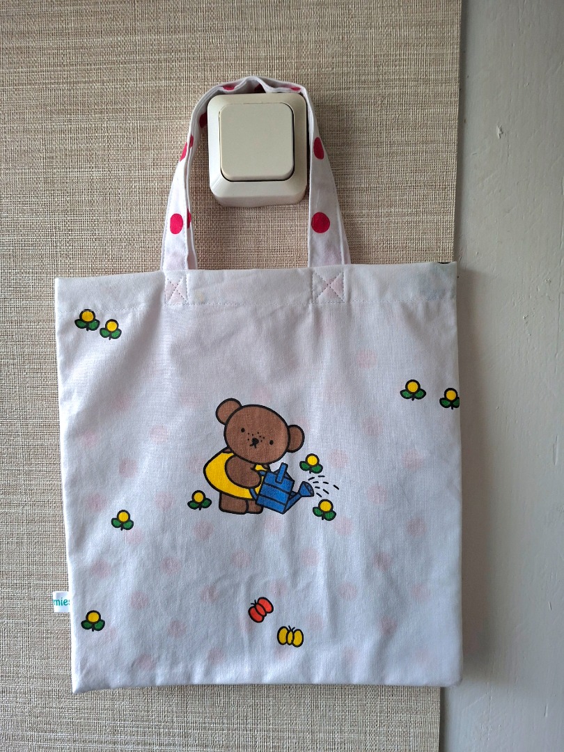 Kleine katoenen tas met de afbeelding van Boris. De achterkant heeft roze stippen. Het tasje is 27 cm breed en 29 cm hoog. De tas is niet gevoerd.