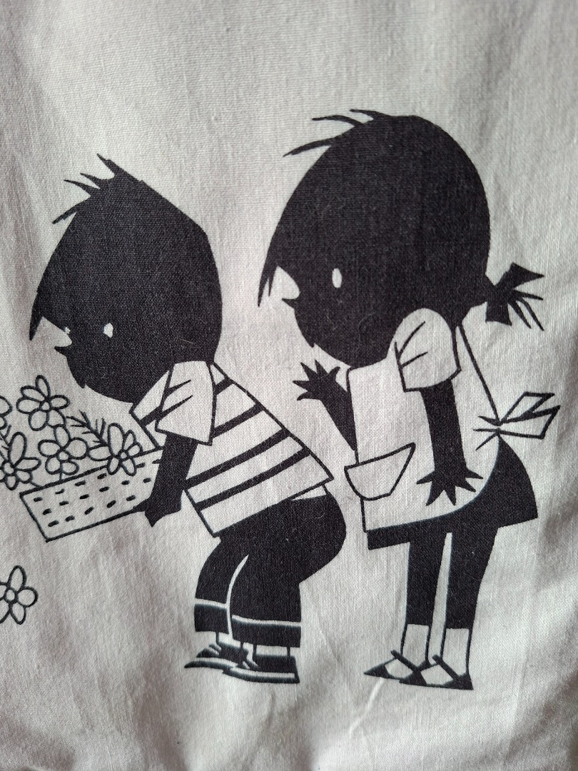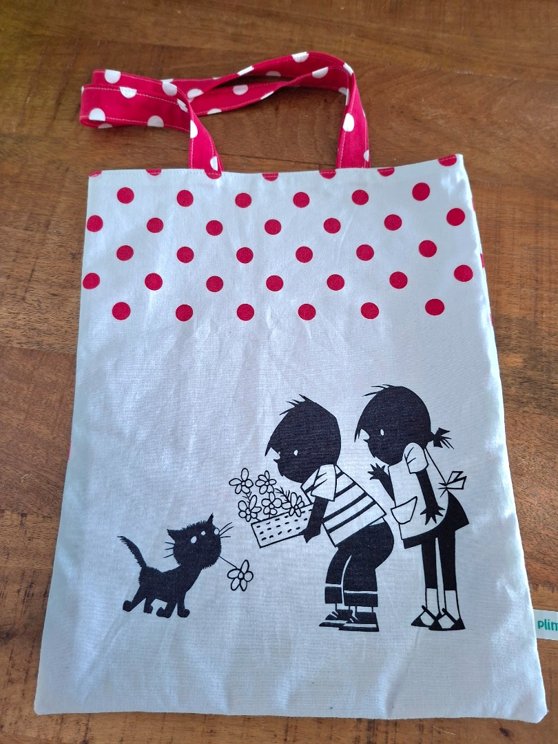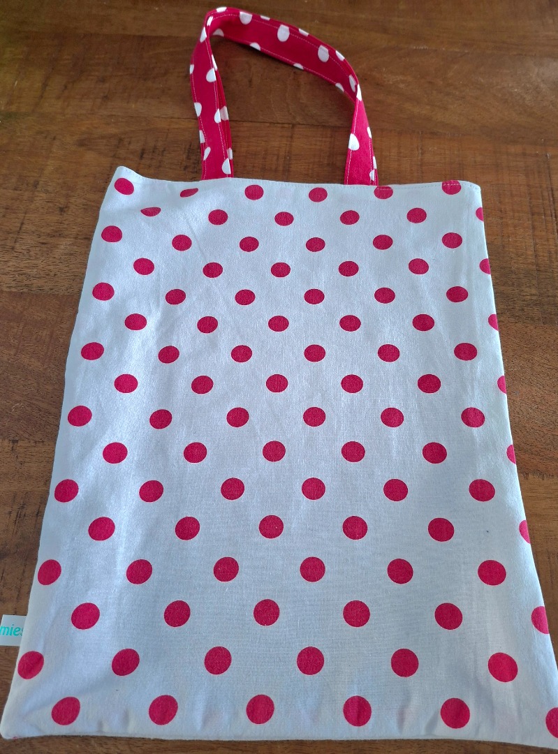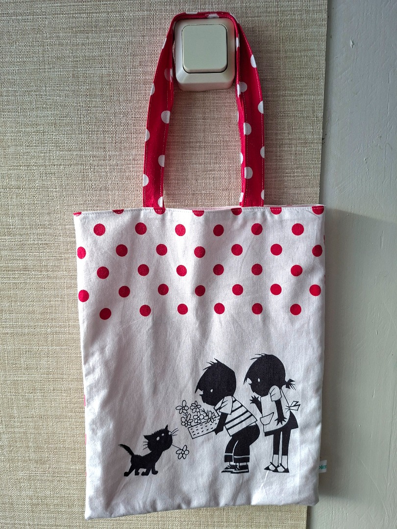 Katoenen tas met de afbeelding van Jip, Janneke en Siepie. De achterkant heeft roze stipjes en de hengsels zijn roze met witte stippen. De binnenkant is licht roze en heeft een zakje. De lengte van de tas is 36,5 cm en de breedte is 28,5 cm. De hengsel zijn 45 cm lang.
