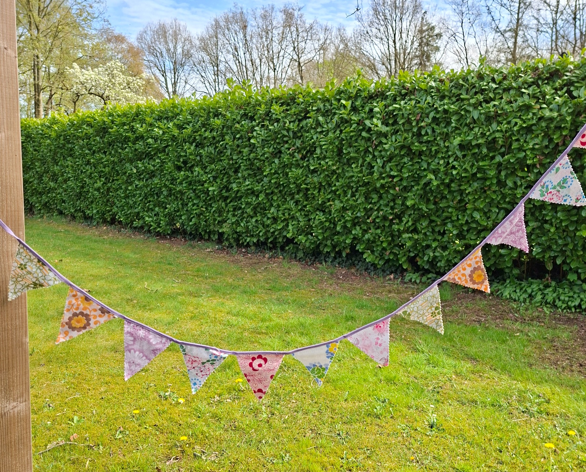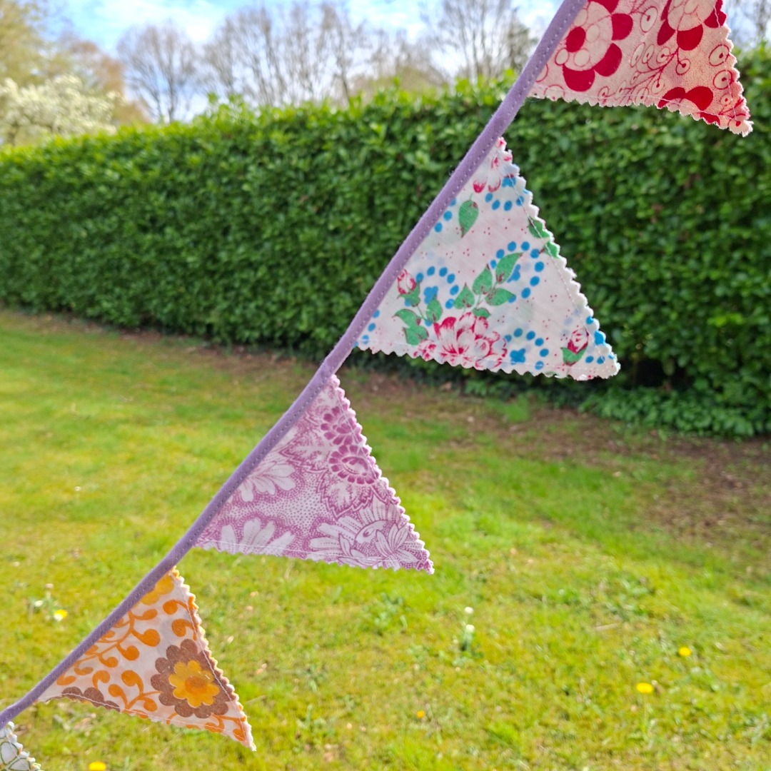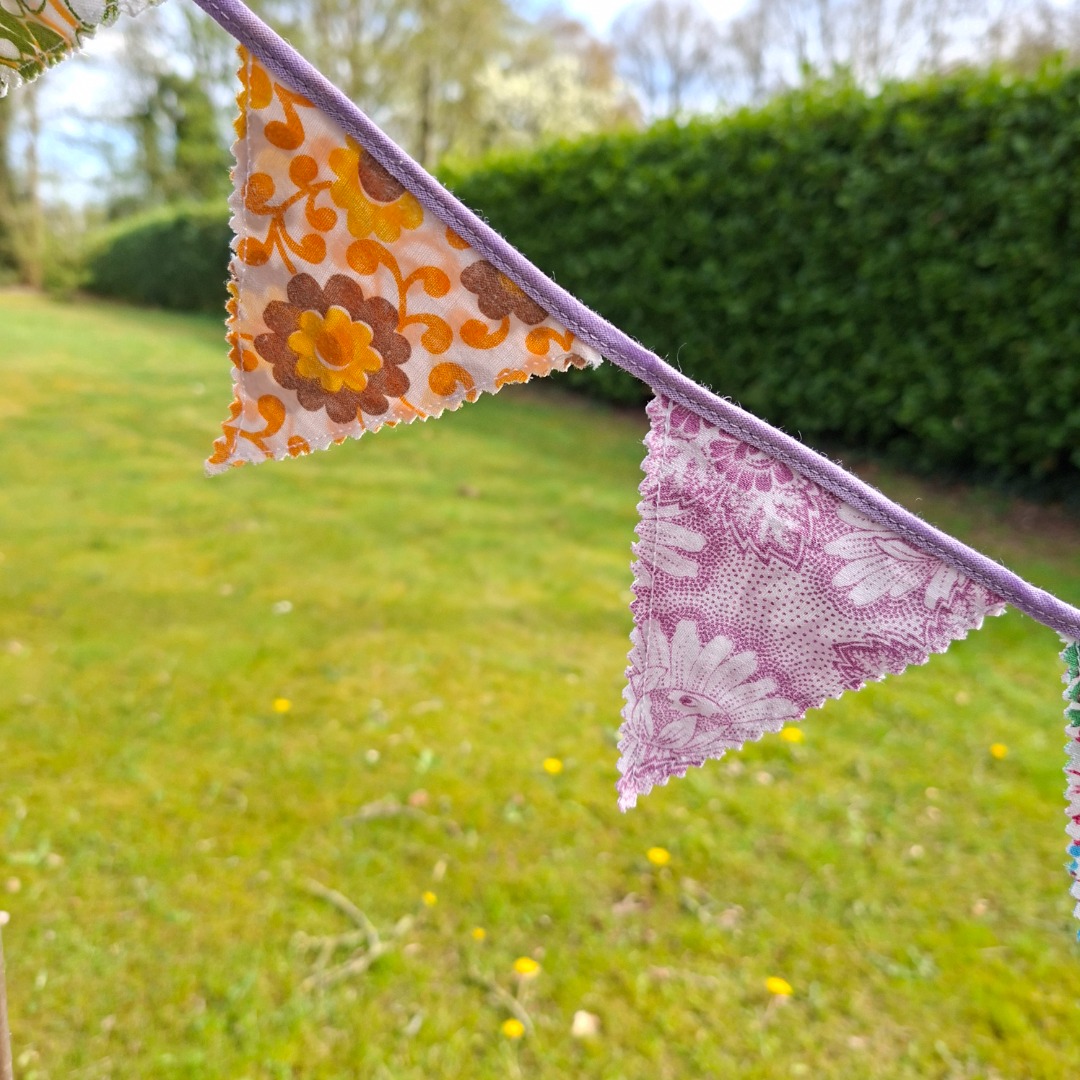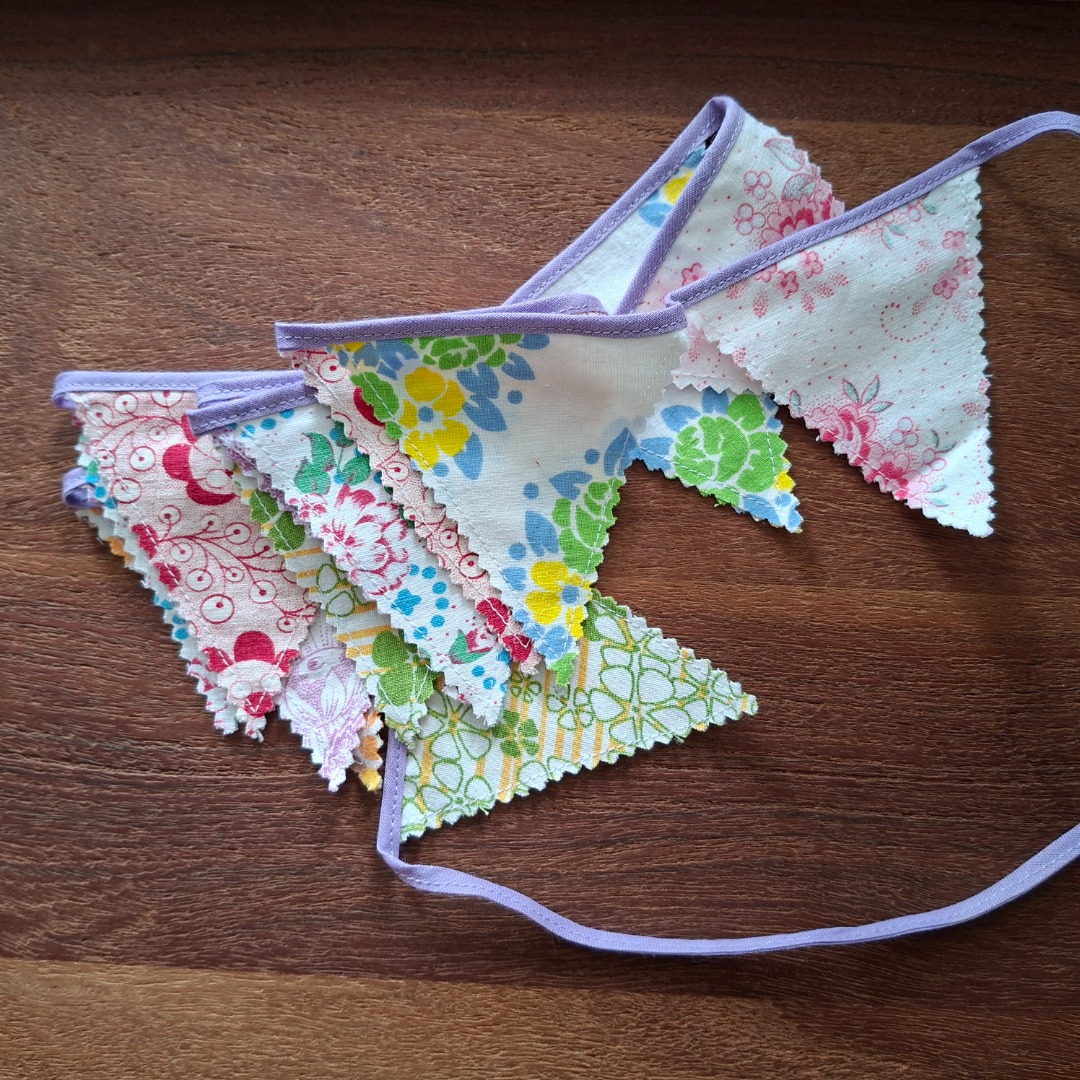 Kleine dubbele vlaggetjes van vintage bloemenstof met kartelrand en paars lint. Deze zijn 8 cm breed van boven en 9 cm lang. Er zitten 14 vlaggetjes aan en is 1,84 meter lang.