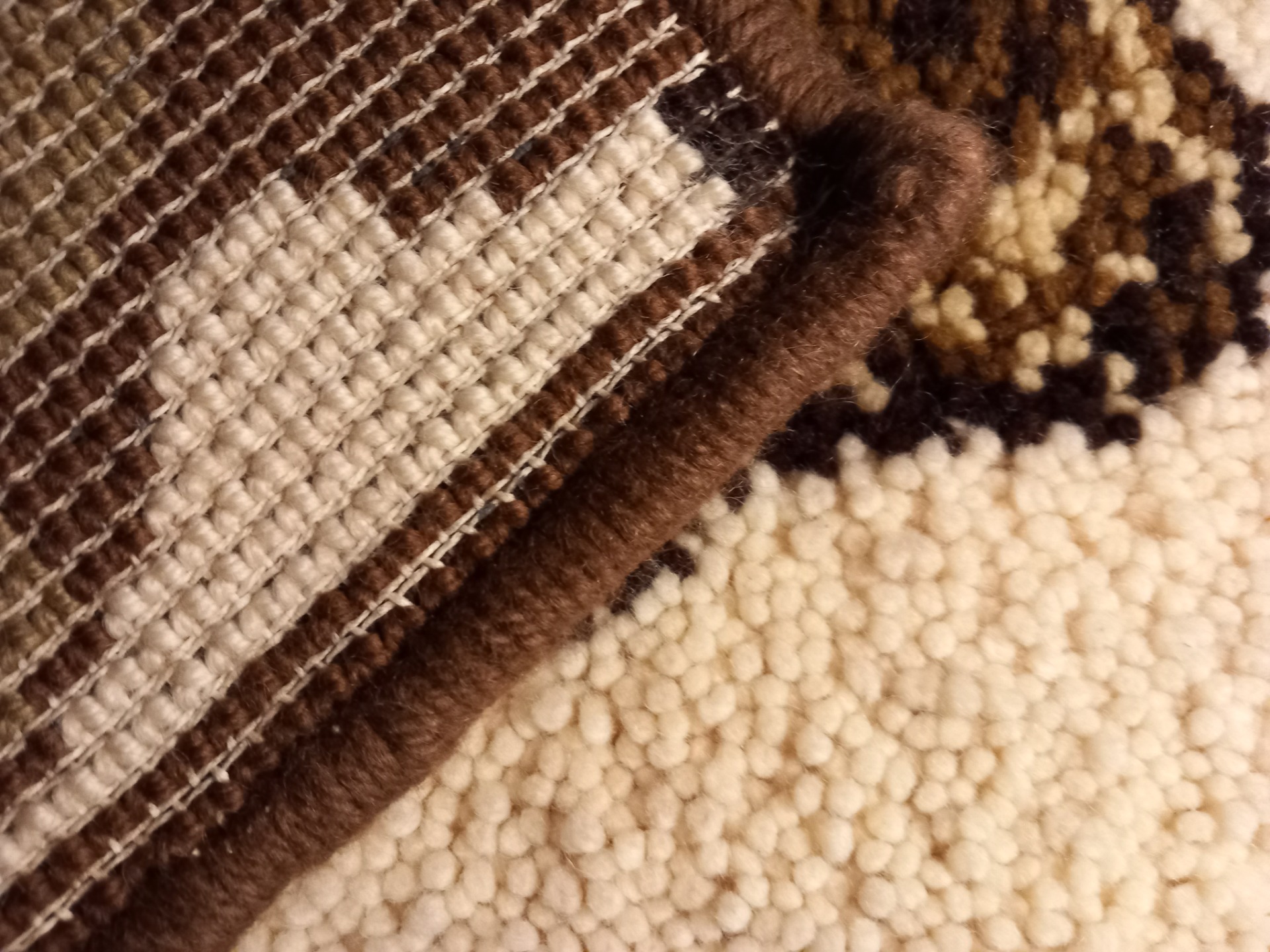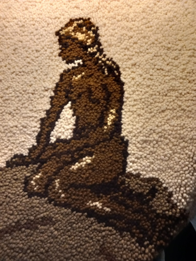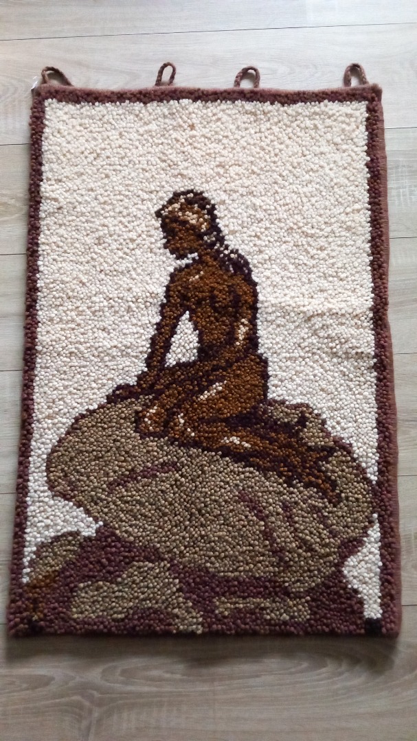Prachtige afbeelding van de zeemeermin van Kopenhagen. In bruintinten met crèmekleur. De afmeting is 60 x 90 cm. Er zitten lussen aan om het op te hangen maar is ook mooi als vloerkleed. Ook mooi afgewerkt aan alle kanten.