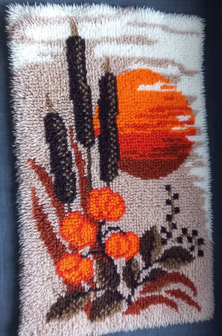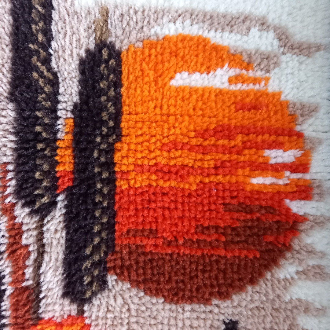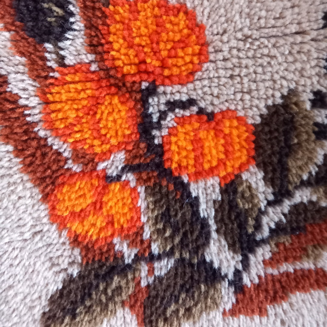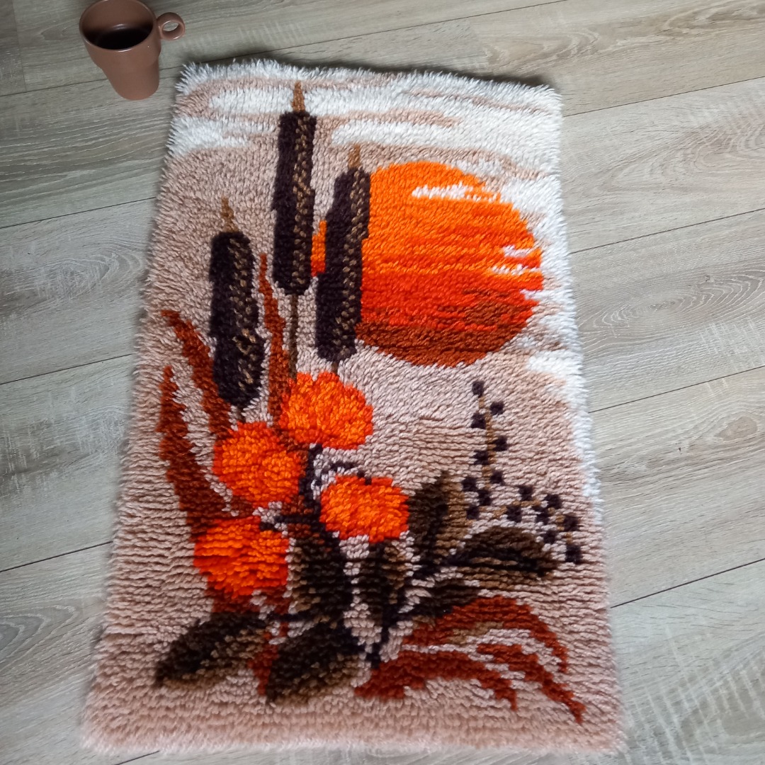 Deze hoogpolige Smyrna kan als wandkleed (zelf nog haakjes aan bevestigen) of als vloerkleed. Het heeft een afbeelding van een natuurthema in oranje, bruin en creme kleur. Dit kleed komt uit Zweden. De afmeting is 45 x 78 cm.