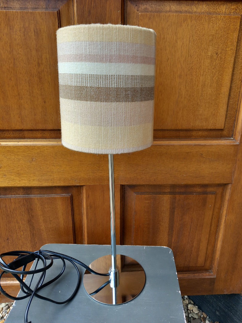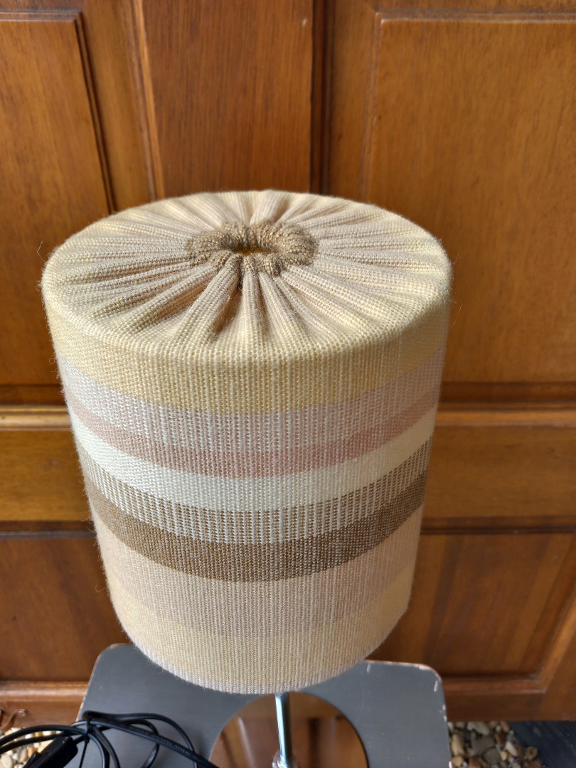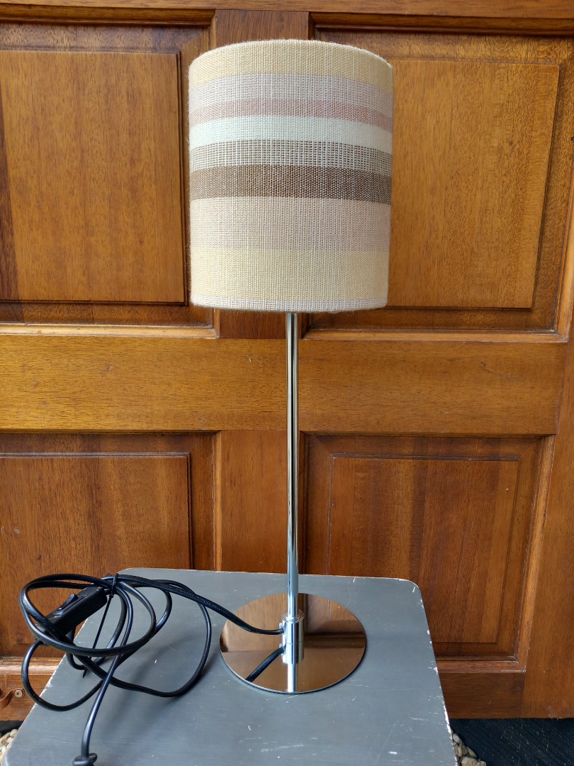 Tafellamp in zilverlook met een stoffen kap. De hoogte is 45 cm. Het kapje heeft een doorsnee van 13 cm en is 16 cm hoog.