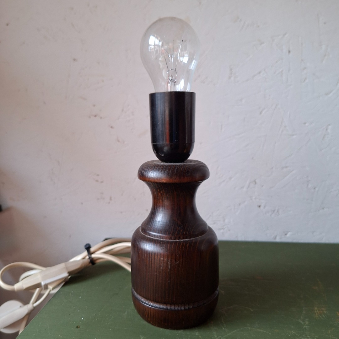 Donkerbruine houten tafellamp van 14 cm hoog. Met lichtbruine stoffen lampenkap die over de gloeilamp geplaatst wordt. De totale hoogte is dan 28 cm. Er zit geen randaarde stekker aan. Er zit een klein deukje onderaan in het hout.